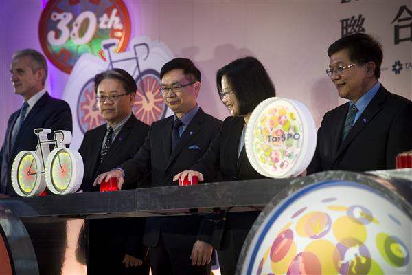總統表示,臺灣是一個充滿潛力的研發和生產基地,期待所有的業者,能把高端的自行車、運動衣、護具、球具或是健身器材,繼續留在臺灣製造,用MIT這塊招牌,行銷全世界。今年的展覽裡面,就有許多廠商,結合物聯網的技術,發展出下一個世代的產品,提供消費者更多元和豐富的體驗。相信在政府政策的支持,以及所有業者的創新和努力之下,臺灣的自行車產業,以及整個體育用品的供應鏈,都會繼續維持世界領先的地位。
