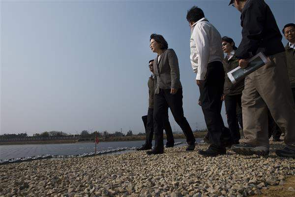 總統說,今天訪視的地方,是「2017桃園農業博覽會」的預定場址,眼前的埤塘是農博中展示用的「光電埤塘」,希望藉此能讓全臺灣看見,埤塘不只可以滯洪、灌溉及養殖,還可以發揮更有效益的發電功能。
