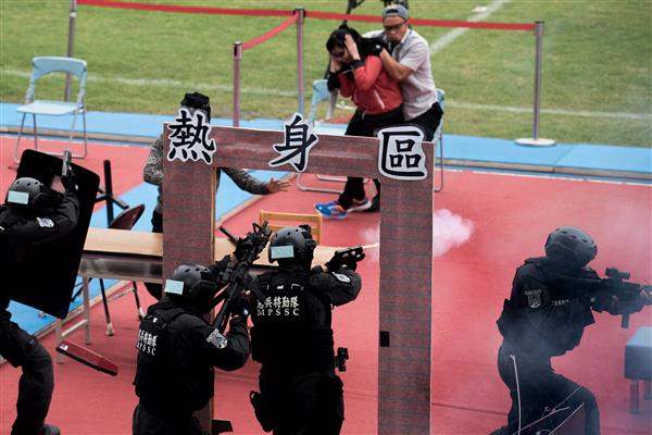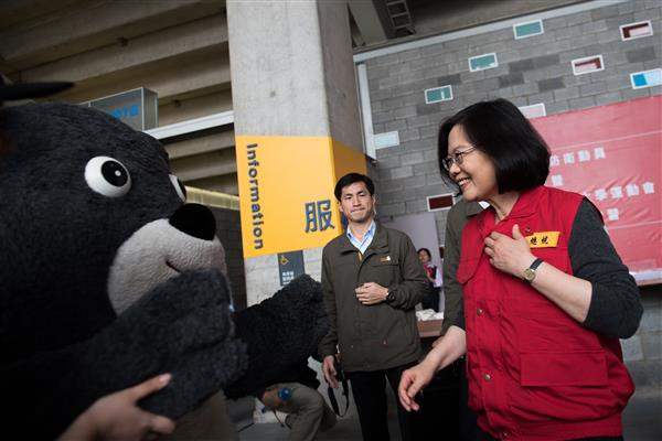 總統抵達後先與世大運吉祥物「熊讚」合影,接著進入觀禮台觀賞演練情境及各項演練介紹,並視察臺北市政府設置的各組前進指揮所。