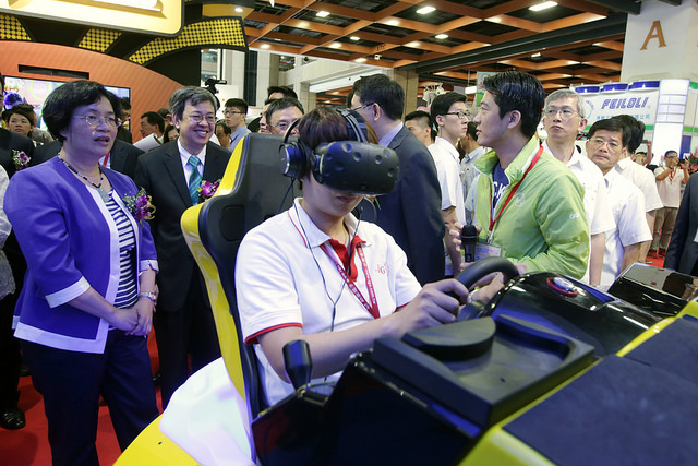 隨後,副總參觀展場,瞭解產業發展現況,並實際體驗遊戲機操作,親自戴上VR頭盔,感受騎馬及射擊的動感實境。