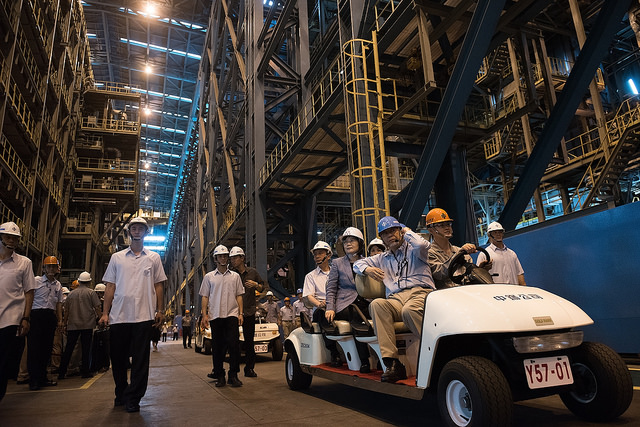蔡英文總統今(16)日上午視察「中國鋼鐵公司」,聽取營運近況簡報、研發成果導覽,並在董事長翁朝棟陪同下,參觀中鋼第三冷軋廠的設備與產製流程運作。