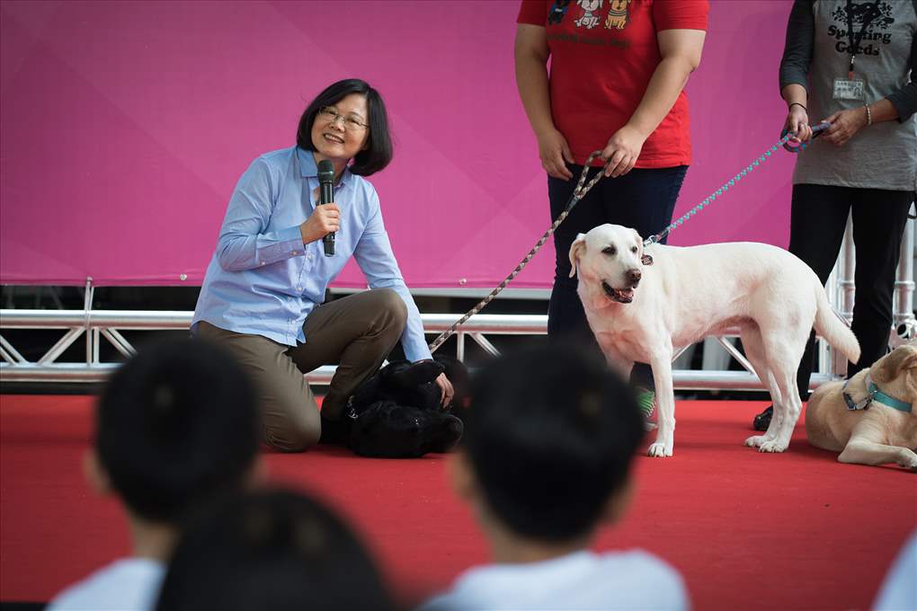 總統也以主人的身分致詞歡迎小朋友今天的蒞臨。總統說,平常官邸內所見到的大人或軍人都很嚴肅,但今天看到這麼多小朋友,「讓官邸看起來很不一樣。」總統並分別介紹她的寵物家人,同時也是官邸的主人:Bella、Bunny、Maru等3隻退役導盲犬,以及貓咪蔡想想。