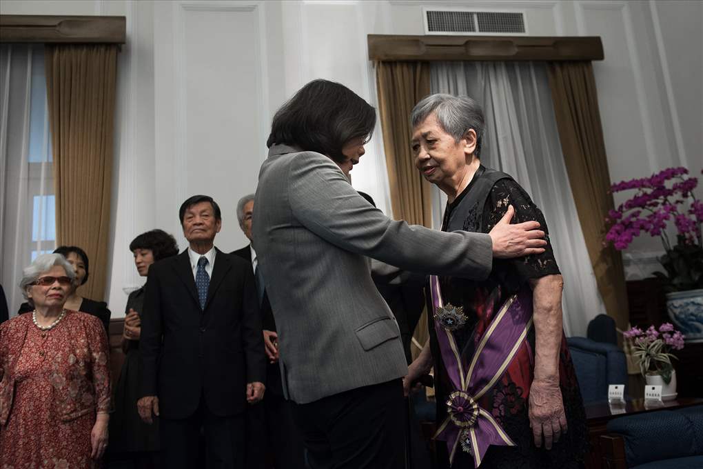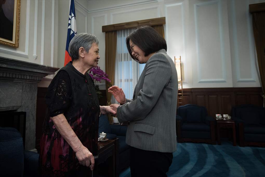 總統親為李淑德佩掛勳章後,與她話家常,關切其身體近況;李淑德亦向總統表達感謝之意,並談到總統的工作十分辛苦,幫總統加油,現場氣氛溫馨歡愉。