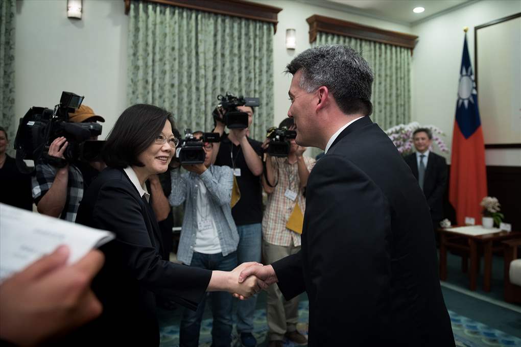 訪團一行由「美國在臺協會」臺北辦事處處長梅健華(Kin Moy)陪同,前來總統府晉見總統,總統府秘書長吳釗燮及外交部長李大維也在座。