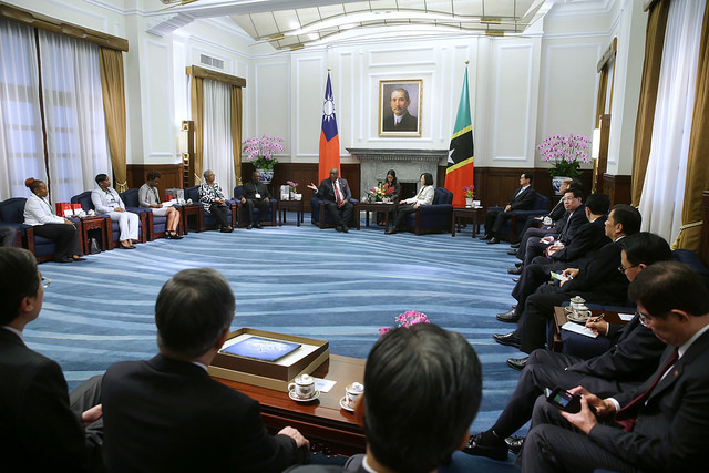 訪賓一行由外交部長李大維及駐聖克里斯多福及尼維斯大使丘高偉陪同,前來總統府晉見總統,國家安全會議秘書長嚴德發及總統府副秘書長劉建忻也在座。