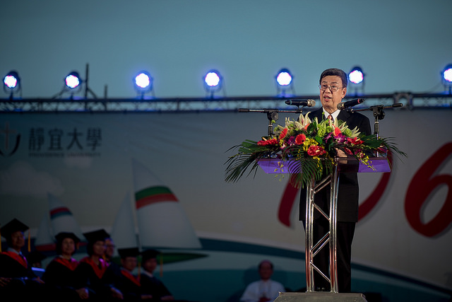 副總統致詞時表示,做為一位天主徒,很高興今天有這個機會為靜宜大學的畢業生勉勵祝福。他憶及2005年6月回臺大任教時,亦曾受邀來此致詞;另外去(2016)年靜宜大學60週年校慶,他因公務未能出席,則特別題詞「育才致遠」並錄製影片以祝賀。12年後的今天再次踏入這個校園,不僅看到靜宜大學的綠樹更加茁壯,校園景觀更加美麗,也感受到在全體師生的努力下,靜宜大學認真辦學、追求真理的精神。