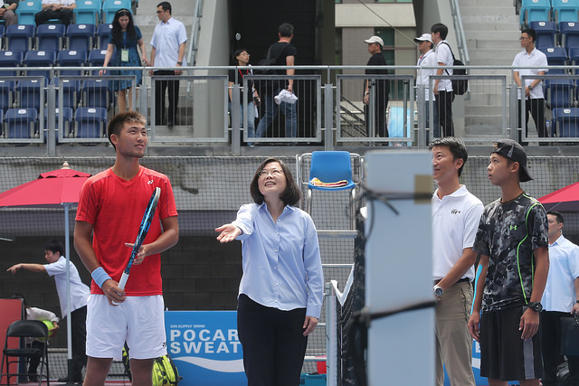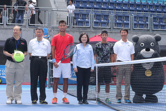 隨後,總統參觀戶外球場,並進入主球場為「2017臺北世大運測試賽-2017台塑盃國際男女職業網球錦標賽男子單打比賽」開場擲幣並觀賞賽事,瞭解網球中心使用情形。