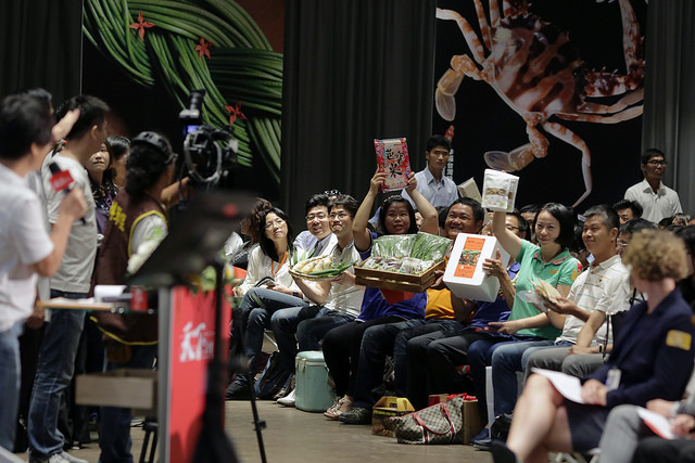 總統抵達會場後,首先參觀桃園市及新竹市展出的「青農返桃」與「風城飄香」食材攤位,瞭解地方農業特色食材;並與現場來賓進行「食問食答」遊戲。總統在回答來自全臺各地小農與主廚代表的問題時表示,臺灣的糧食自給率偏低,這是政府要檢討之處,主要是因為大部分農地都偏向生產稻米、進口雜糧,導致臺灣糧食自給率偏低,要解決這問題就是要調整農作物種植比率,目前農委會已有政策鼓勵農民種植「有機、無毒」的雜糧,並將有機、無毒做為我們農業的特色,另一方面,政府也將著手推廣食安教育,來扶植本土農業。