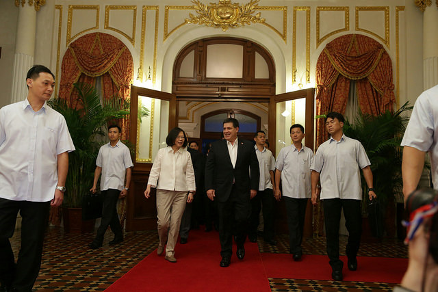 我友邦巴拉圭共和國總統卡提斯(Horacio Cartes)今(11)日率團訪臺,進行為期3日之國是訪問,蔡英文總統晚間於臺北賓館設宴款待,歡迎訪團一行。