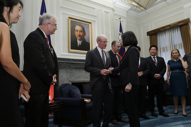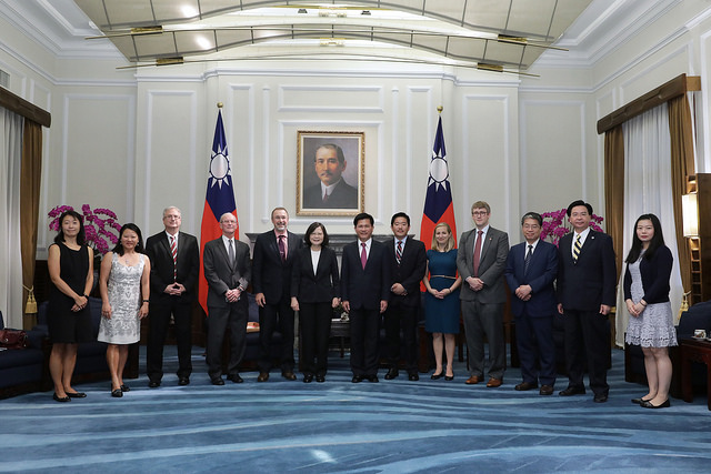 訪賓一行由外交部部長李大維陪同,前來總統府晉見總統,總統府秘書長吳釗燮、臺中市市長、台灣智庫董事長林佳龍也在座。