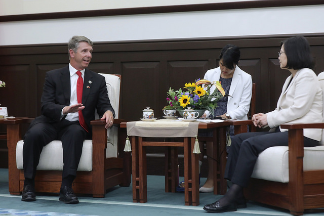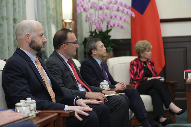 訪團一行由美國在台協會(AIT)臺北辦事處處長梅健華(Kin Moy)及外交部政務次長章文樑陪同,前來總統府晉見總統,總統府秘書長吳釗燮、國家安全會議秘書長嚴德發也在座。