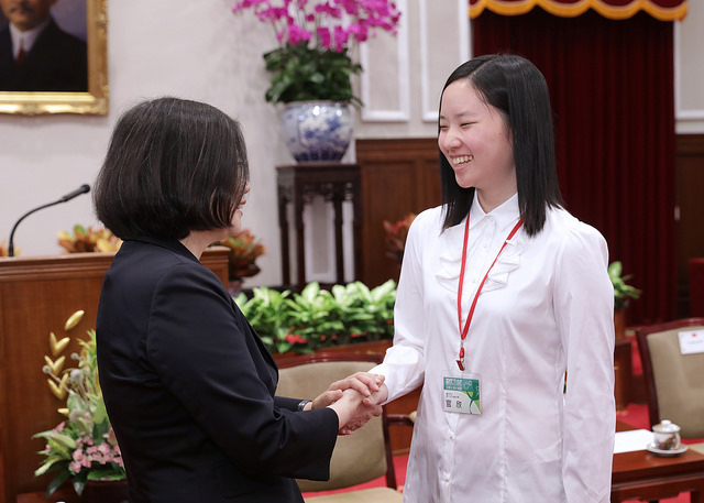 總統致詞時表示,每一位站到世界舞台上的同學都代表臺灣。我國今(2017)年參加4項國際學生科展競賽,總計拿到1金、5銅、1項大會四等獎,以及1項特別獎,能有這樣的成績,實屬不易。她除恭喜所有獲獎同學及指導老師,也期勉在座同學都能再接再厲。