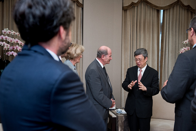 訪賓一行尚包括Clinatec生物醫學中心挹注基金主任博斯可(Thierry Bosc)、Soitec公司創辦人兼榮譽主席奧貝統·赫維(André-Jacques Auberton-Hervé),由國家實驗研究院副院長吳光鐘、法國在臺協會代理主任華繼詠(Guillaume Roy)等人陪同,前來總統府拜會副總統。