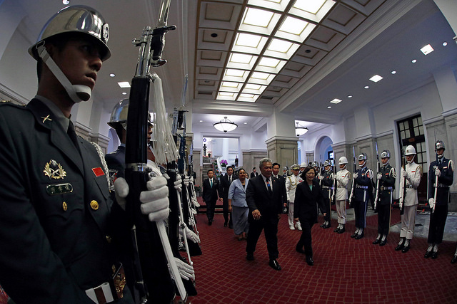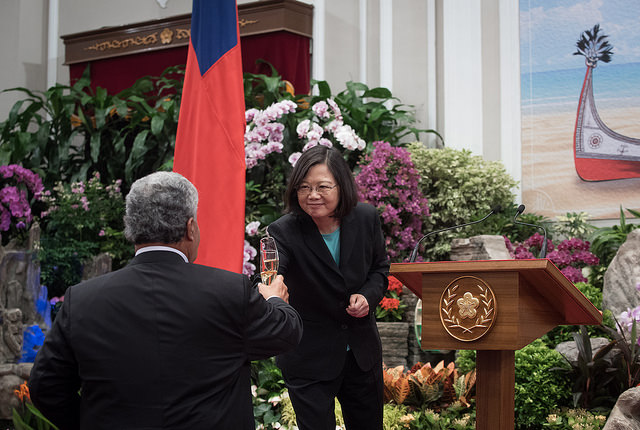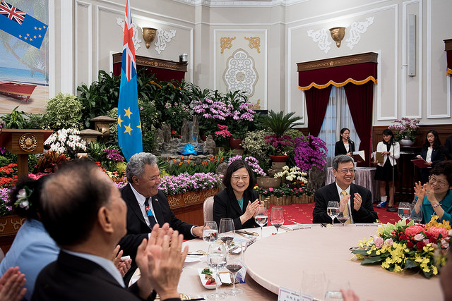 蔡英文總統今(13)日午間偕同陳建仁副總統伉儷在總統府以國宴款待吐瓦魯國總理索本嘉(Enele Sosene Sopoaga)伉儷暨訪團成員,並以隆重軍禮歡送國賓一行。