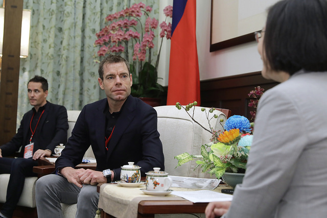 蔡英文總統今(16)日下午接見參加「2017臺灣自行車登山王挑戰」活動國際知名選手卡德‧伊文斯(Cadel Evans),期盼透過自行車運動,增進臺灣與世界的聯結。