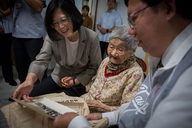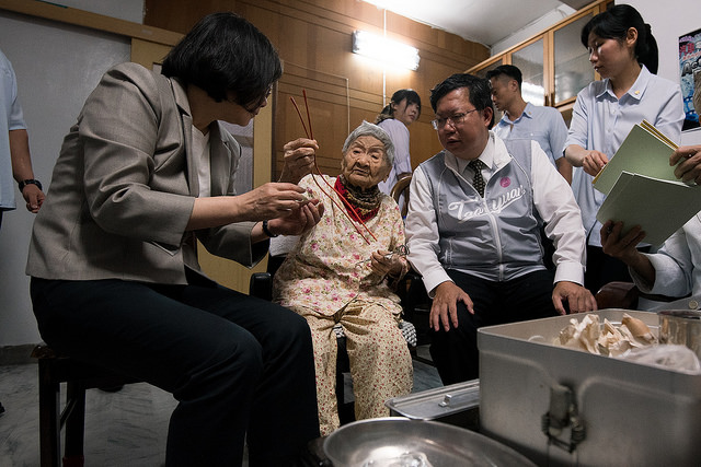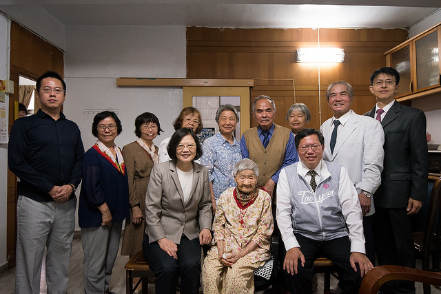 重陽節將屆,蔡英文總統今(20)日上午由桃園市長鄭文燦、衛生福利部次長呂寶靜陪同,訪視桃園百歲人瑞謝林霞妹阿婆。