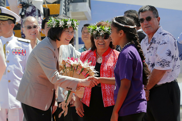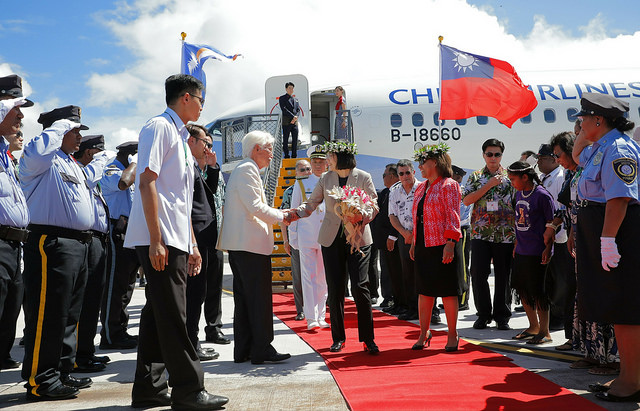 專機停妥後,我駐馬紹爾群島共和國大使唐殿文及馬國外交暨貿易部次長Bruce Kijiner登機迎接蔡總統,海妮(Hilda C. Heine)總統暨夫婿偕大酋長Iroijlaplap Patrick Lein Zedkaia、馬久羅市長Ladie N. Jack迎於機梯前;蔡總統下機後,接受馬國禮賓人員獻戴迎賓花環及學童獻花,海妮總統並陪同蔡總統沿紅地毯前進,接受兩側馬國國家警察儀隊致敬。