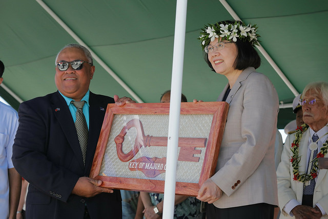 在機場歡迎儀式中,海妮總統請馬久羅Jack市長呈贈馬久羅市鑰;隨後,蔡總統致詞表示,去(2016)年5月,海妮總統曾率團訪問臺灣,來參加她的就職典禮。當時她對同樣是女總統、又是傑出教育家的海妮總統,留下深刻印象。今日很高興再次見到海妮總統,且正式訪問馬紹爾群島。這也是她就任總統以來,第一個拜訪的太平洋友邦。