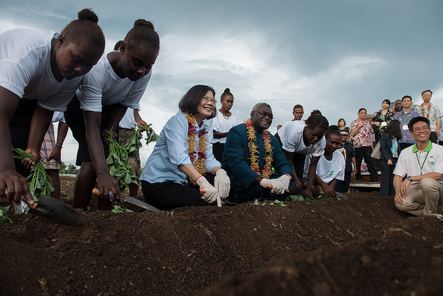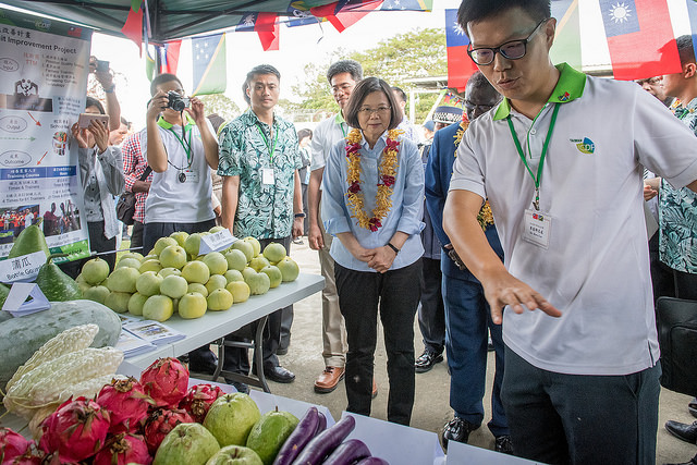 總統抵達駐索技術團後,由索國總理蘇嘉瓦瑞(Manasseh Sogavare)及農業部長Dudley Kopu陪同,聽取團長薛烜坪「糧食作物及蔬果改善計畫」、「養豬整合計畫」簡報以及成果展示導覽。現場還有索國排竹樂隊及傳統歡迎舞蹈表演,氣氛輕鬆歡愉。之後,總統也與蘇嘉瓦瑞總理一起步行至菜園,親自與索國學生體驗栽種臺灣地瓜種苗。