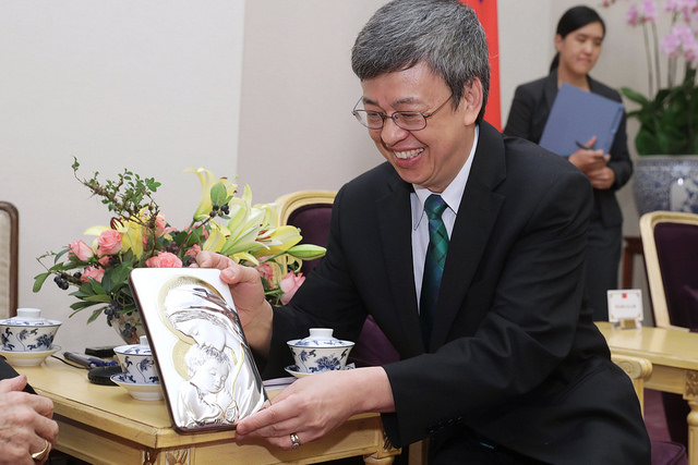 訪賓一行由教廷駐臺大使館代辦高德隆(Slađan Ćosić)、外交部次長章文樑陪同,前來總統府拜會副總統。