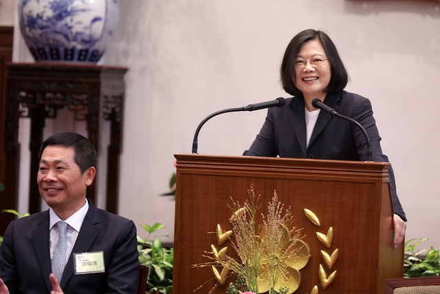 總統也提到,臺灣在戰後經濟發展的過程中,女性一直扮演重要角色。許多企業,特別是中小企業裡的「頭家娘」常是公司的支柱。因此,她也要藉此機會向所有獲得「創業相扶獎」的「頭家娘」致意。