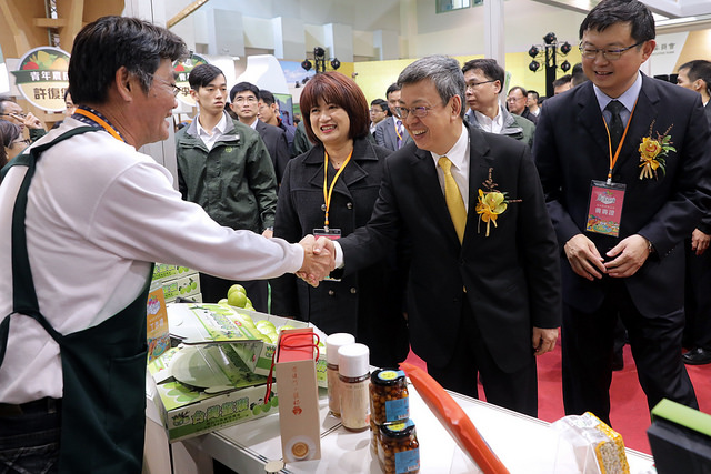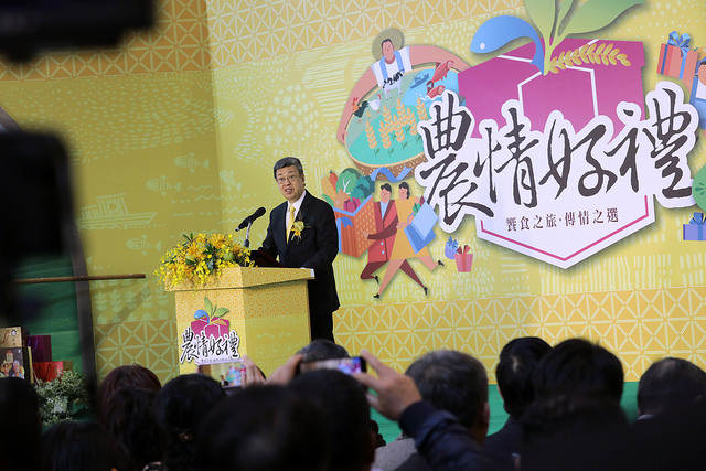 副總統指出,近來行政院農委會印刷精美的農漁會百大精品型錄寄送給全國一千大企業,希望成為年節贈禮及股東會禮品採購的選項。今天在現場可以看到許多農業精品的展示,已經顛覆了過去民眾對農產品的刻板印象,這些農漁會品牌的產品,以「嚴選製造、在地生產」的精神,搭配精緻且具特色的包裝,充分展現在地農漁會精品的優質形象,他鄭重向國人同胞及國際友人推薦臺灣在地的農業精品,歡迎消費大眾及企業界踴躍採購。