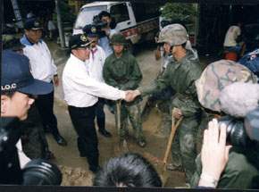陳總統水扁先生今天上午前往台北火車站和汐止青山國中、大同路中正路一帶、長安國小等地區,勘察納莉颱風所造成的積水、淤泥清除情形及慰勉協助救災之國軍官兵弟兄與所有工作夥伴。