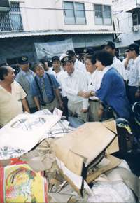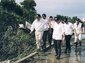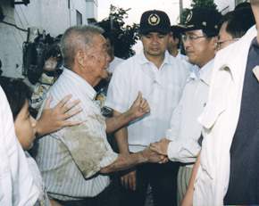 最後,總統也在蔡同榮立委的陪同下,到嘉義市湖內里勘察 淹水情形,總統也請水利單位儘速前往勘察造成淹水的八掌溪溪底淤泥及橋孔過小的問題。