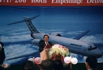 很高興再一次來到漢翔參觀,看到漢翔公司從軍方的航發中心改制成立以來,不僅按照原定計畫順利完成了經國號戰機一百三十架的生產,並且持續對我國自主戰機提供性能提升和整體後勤技術服務,有效支援戰備,提升國家戰力;同時在工程系統整合及高精密、高品質的軍、民用航空科技方面不斷創新;也積極地推動多項國際合作開發民用飛機及發動機的新產品,今天看到漢翔公司和全世界最大的飛機製造廠家波音公司合作開發的七一七客機機尾段生產了一百架,呈現了漢翔公司努力朝企業化與國際化發展,開創我國兼顧軍、民用途的新興航空產業的企圖心。