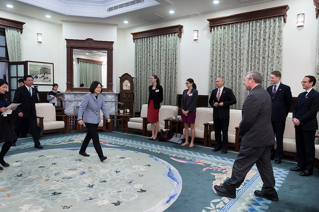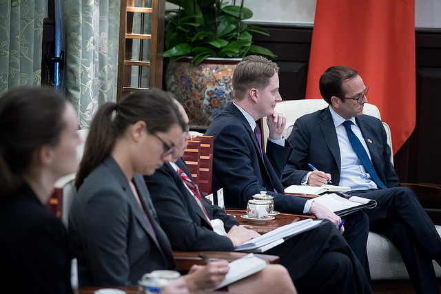 訪賓一行包括「歐亞集團」亞洲部門執行理事麥艾文(Evan S. Medeiros)、布魯金斯研究院桑頓中國中心研究員何瑞恩(Ryan Hass)及戰略暨國際研究中心亞洲計畫資深研究員王曉岷(Robert Wang)等,由布魯金斯研究院桑頓中國中心資深研究員杜大偉(David Dollar)率領、外交部次長章文樑陪同,前來總統府晉見總統,總統府秘書長吳釗燮也在座。