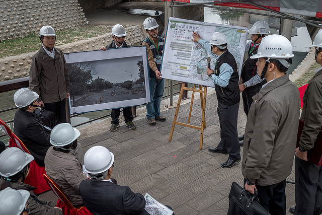 總統抵達後先勘查雲林溪,隨後聽取雲林縣政府水利處處長許宏博簡報雲林溪河川治理、水環境改善工程及綠能景觀計畫與願景。