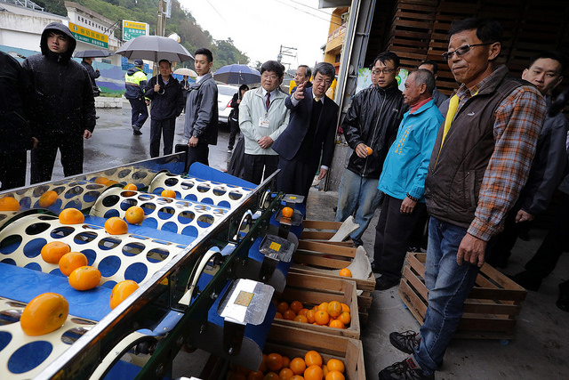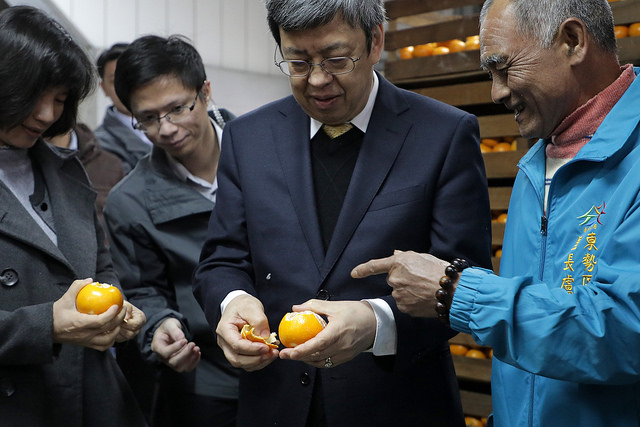 揭牌典禮活動結束後,副總統也由林副市長陪同參訪東勢區柑桔產銷班第12班,除聽取農民栽培及採收說明,並親自體驗採果,參觀產銷班機器選果及包裝分裝的作業情形,肯定農友在柑橘種植所做的努力。