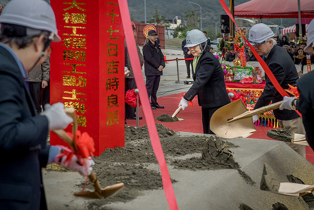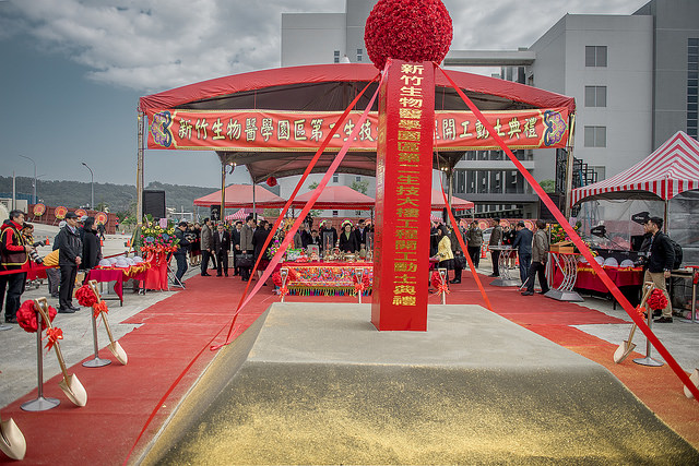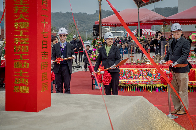 隨後,總統與行政院政務委員吳政忠、科技部長陳良基、新竹科學工業園區管理局局長王永壯、立法委員柯建銘、邱泰源、林為洲及新竹縣副縣長楊文科共同進行動土儀式,祈願施工平安順利。