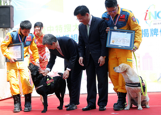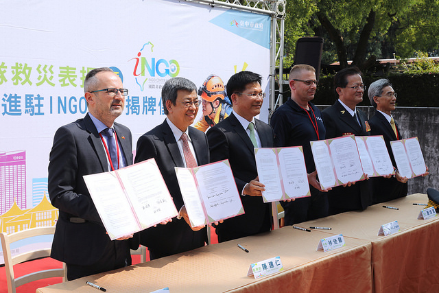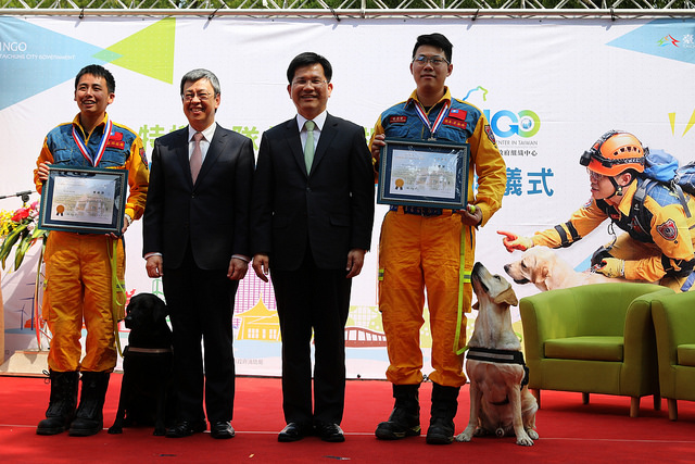 隨後,副總統與現場貴賓共同進行「國際救援組織進駐INGO中心」的揭牌儀式,並參觀INGO中心。稍早,副總統也見證臺中市政府消防局與「德國聯邦救難犬協會(BRH)」,以及中興大學獸醫學院與德國國際搜救隊(ISAR)簽訂合作備忘錄(MOU),以期強化日後搜救犬搜救能量,並提升我國在國際的搜救訓練與交流。