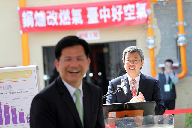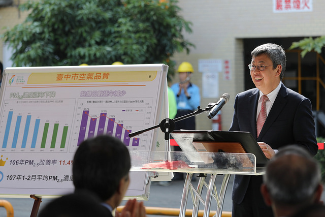 副總統提及,從稍早環保局的簡報中,可以看出臺中市政府致力於改善空污,且成效良好。目前已有48家完成改用燃氣鍋爐,污染減量PM2.5 7公噸、硫氧化物116公噸、氮氧化物65公噸。他相信,若能持續保持這樣的成果,臺中空氣污染的防制一定會越來越好,並且成為臺灣其他城市的典範。