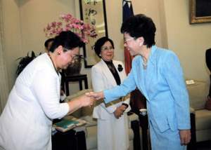 下午前來總統府拜會副總統的韓國代表團成員包括:Dr. Un Na, Huh(國會議員)、Mrs. Lan Young, Moon(世界和平婦女會總會長)、Mrs. Won Kang, Chang(韓國女性宗教協議會會長)、Mrs. Naoko Isa Brazil(世界和平婦女會總會國際部主任)、Mrs. Dae Wha, Chung(世界和平婦女會韓國分會會長)、Mrs. Hyun Kyung, Lee(世界和平婦女會韓國分會會計長)、Mrs. Sir Young, Park(南韓前總統朴正熙之女)、金達中教授(韓國延世大學教授);日本代表團成員包括:Hon. Yukiko Kawahashi(日本國會議員)、Mrs. Motoko Sugiyama(世界和平婦女會駐聯合國代表)、Mrs. Tetsuko Kuboki(世界和平婦女會日本分會會長)、Mrs. Kyoko Furuta(世界和平婦女會日本分會副會長)、Mrs. Kinko Sato(廿一世紀日本經援中國圓桌會議委員會前任委員)、Mrs. Chiyo Kuwabara(世界和平婦女會日本分會公關部主任);各國代表為:Dr. Varahagiri Mohini Giri(印度前總統Giri之媳婦)、Hon. Carmen Garri(菲律賓國會議員)、Hon. Kusumalavatee Sirikomut(泰國國會議員)、Mr. Duncan Graham(全球公民協會主席)、Ms. Meera Khamma(南亞地區婦女和平機構創辦人)、Mrs. Kamolthip Phayakvichien(世界和平婦女會泰國分會會長)、Hon. Nestor Villasin(菲律賓垥克羅班市副省長),外交部亞太司副司長廖港民也在座。
