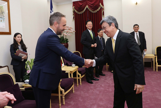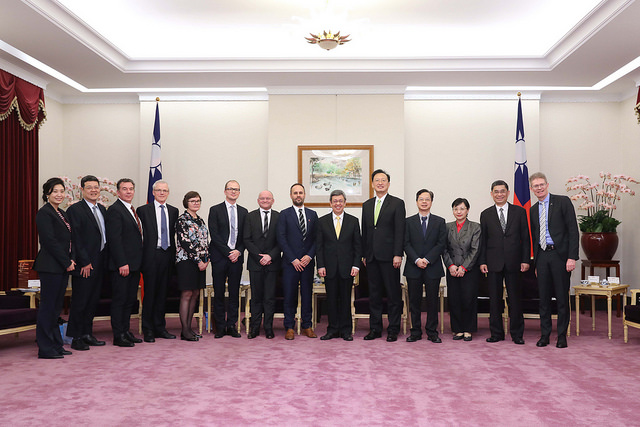 訪賓一行包括丹麥商務辦事處處長倪安升(Nicholas Enersen)、丹麥退休基金執行長裴德森(Torben Möger Pedersen)、丹麥國家出口信貸執行長伊柏安(Anette Eberhard)及哥本哈根基礎建設基金臺灣區計畫董事長艾卓儒(Anders Eldrup)等人,由外交部次長吳志中、經濟部次長龔明鑫陪同,前來總統府拜會副總統。