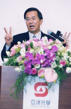 陳總統水扁先生今天上午前往位於台中縣潭子鄉的亞洲光學公司參訪,並廳取相關簡報及實地參觀研發中心和各項產品展示。總統在致詞時表示,對「亞光」不斷與時俱進,由透鏡一直發展到最先進的光通訊元件,一直都居於業界的領導地位,相信在賴以仁董事長的卓越領導下,「亞光」不但是台灣之光、亞洲之光,更會成為世界之光。而「亞光」創業已經有二十二年,兩個「二」代表的是勝利、勝利又勝利;也象徵著成長、成長再成長。