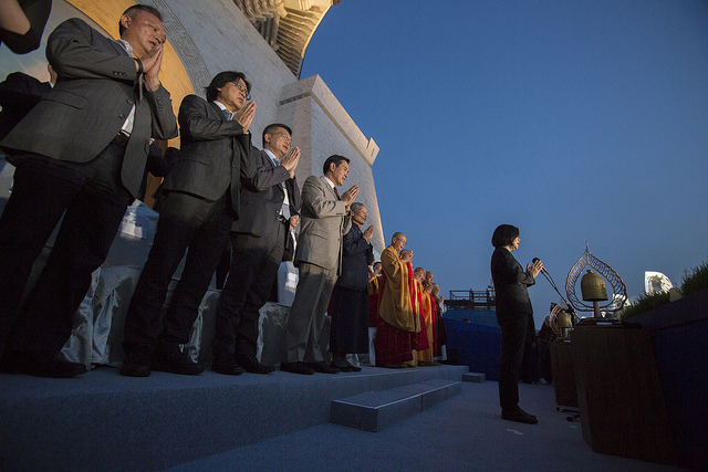 浴佛大典於傍晚6時許開始進行,總統與浴佛大眾齊頌爐香讚及讚佛偈,隨後總統向佛陀行三問訊禮,並觀賞鐘鼓齊鳴,最後進行禮佛足、接花香儀式,祈求人心淨化、社會祥和、百業興盛、國泰民安。
