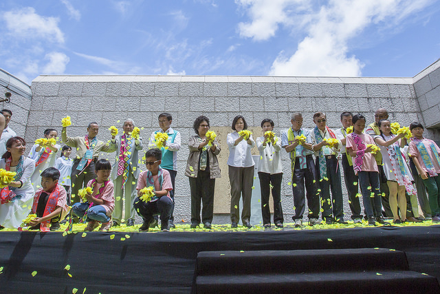 隨後,總統與現場貴賓進行揭牌儀式,見證受難者前輩將象徵和平的彩飄傳承給小朋友,並手持象徵和平、傳承、堅毅的長春花瓣,共同祝福臺灣。