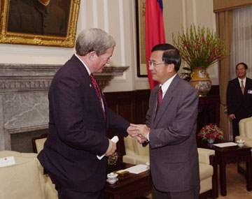 邦德參議員偕助理等一行由我國外交部次長吳子丹及美國在台協會台北辦事處處長薄瑞光陪同,前來總統府會見總統,總統府副秘書長簡又新也在座。