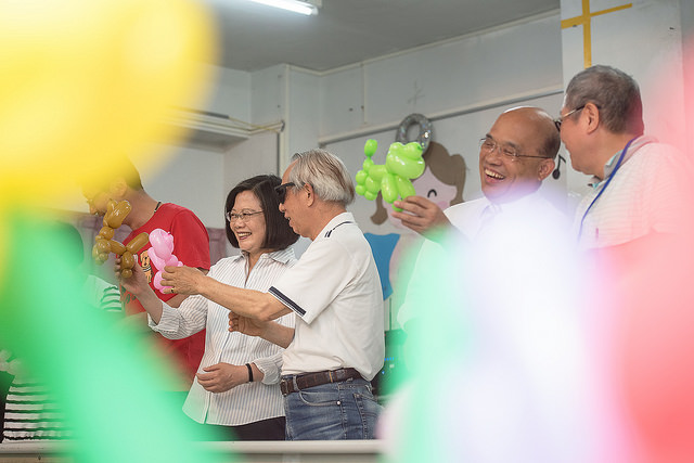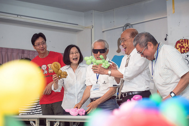 隨後,總統與貴賓在樂活補給站學員的帶領下,一起完成貴賓狗的造型氣球,並接受視障朋友製作送給「官邸三寶」Bella、Bunny以及Maru的花圈氣球。