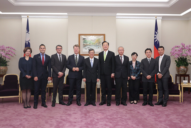 訪賓一行尚包括婚姻平權大平台總召集人呂欣潔,由外交部次長吳志中及法務部次長張斗輝陪同,前來總統府拜會副總統。