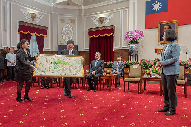 剛才,陳時中部長把這次代表團的旗幟送給我,上面簽滿了這次工作夥伴的名字。這些名字,代表著臺灣走向世界的動力,也代表著各界對臺灣國際參與的期待。