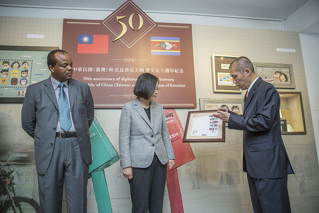 兩國元首首先聽取中華郵政公司董事長魏健宏簡介「臺史建交50週年紀念臨時郵局局贈封組」及「看見臺灣」系列票品。其中,臺史建交50週年紀念臨時郵局集郵票品,係以旅行臺灣郵票為素材,納入史國特色照片為題材之設計;看見臺灣系列票品則是以我國知名導演齊柏林空拍的臺灣美景為題材發行之郵票。