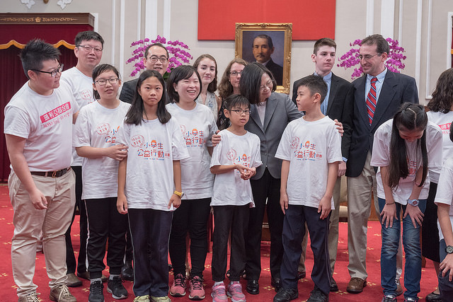 總統說,今天在場還有很多參與「小學生公益行動」的同學,也都跟凱瑟琳一樣,用愛心、勇氣和行動,探索改變的可能。她舉例指出,像是臺中市建功國小發起「零歧視」運動;高雄市林園國小努力解決海洋垃圾問題;新北市心田優遊學園則是走到街上幫助街友。她希望在未來的日子裡,同學們都要用一樣的信念,幫助他人,讓我們的社會變得更好。