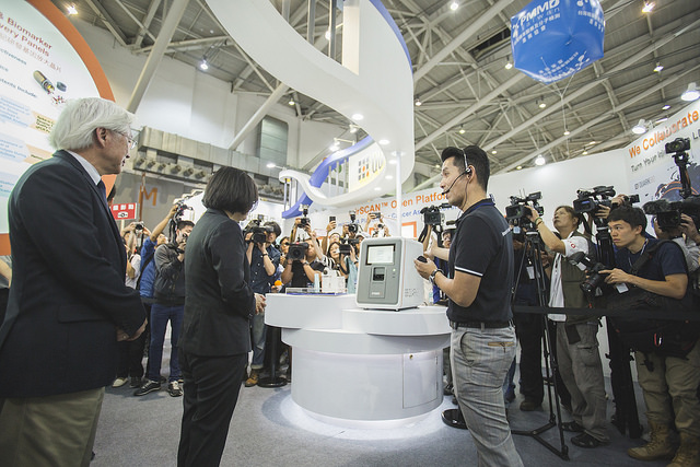 總統說,今天開幕式有很多來自歐美、日韓、東南亞的生醫產業代表。她期待他們可以利用這次的展覽尋找更多跟臺灣法人及企業合作的機會,甚至考慮在臺灣投資。