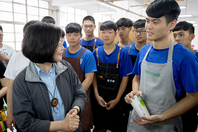 蔡英文總統今(22)日上午前往天主教私立公東高級工業職業學校,參觀教堂,並前往木工室探班,為參加全國技能競賽集訓的木工技職選手加油打氣。