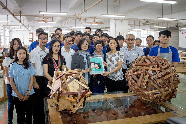 隨後,總統探視公東高工木工技職選手為參加全國技能競賽集訓情形,欣賞學生作品展示,她對同學的每件作品都留下深刻的印象,並在同學木工作品上簽名。接著,校方贈送總統木製鋼筆,總統也回贈紀念品。最後,總統與同學們親切互動、贈送飲料打氣,並與大家合影。