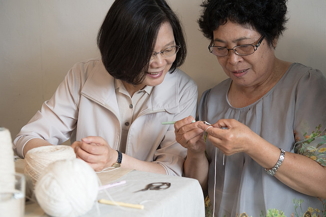 稍早,總統也參訪由部落婦女工班經營的文創產業工坊-棉麻屋,她首先在店長龍惠媚的解說下,欣賞各式棉麻藝品、垂詢文創藝品的製作歷程及經營情形,並與部落媽媽一一親切握手寒暄、話家常,總統稱讚她們的巧手編製如此精美的藝品。由於棉麻屋已成臺東著名觀光景點,總統希望國人多來臺東觀光、參觀難得的手工編織藝品。總統也在編織老師張新妹的指導下,體驗棉麻手作。最後,她選購一頂棉麻帽及伴手禮藝品,也採購棉麻鑰匙圈贈送隨團媒體。
